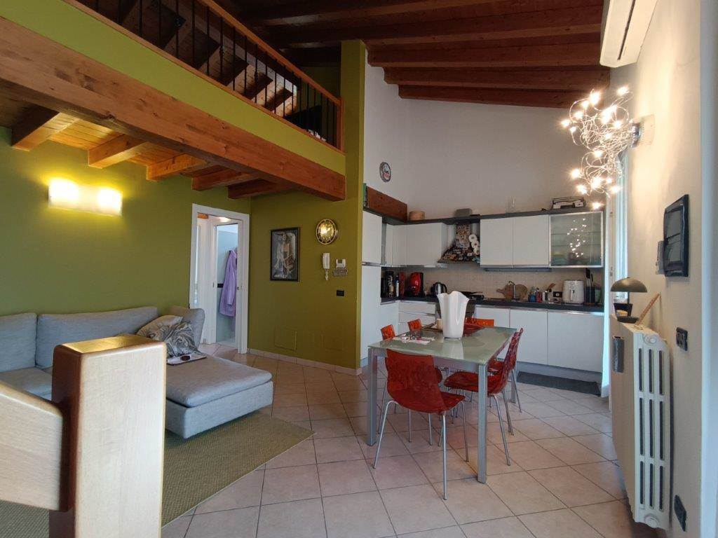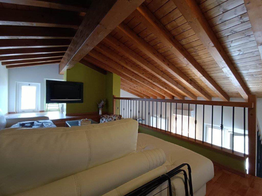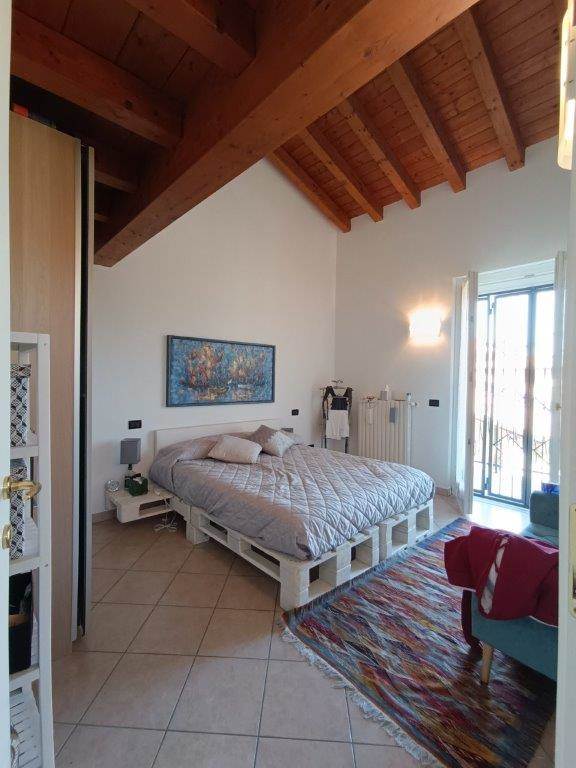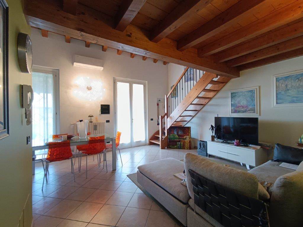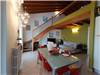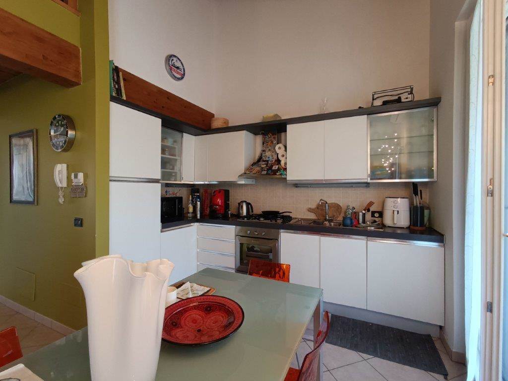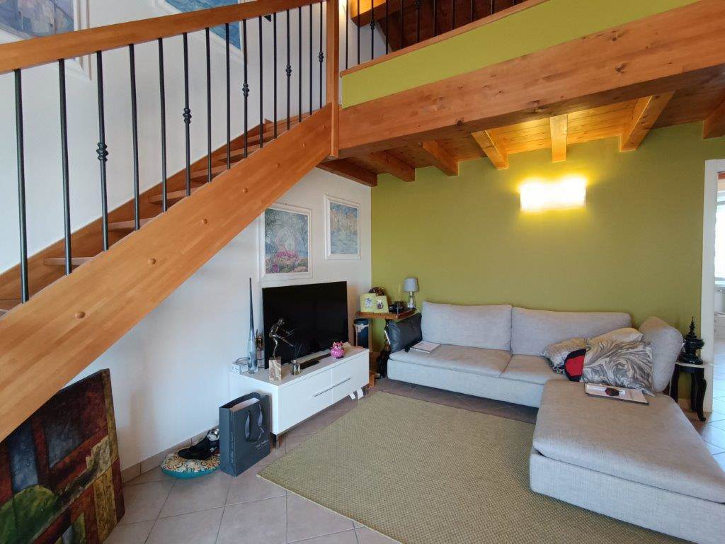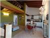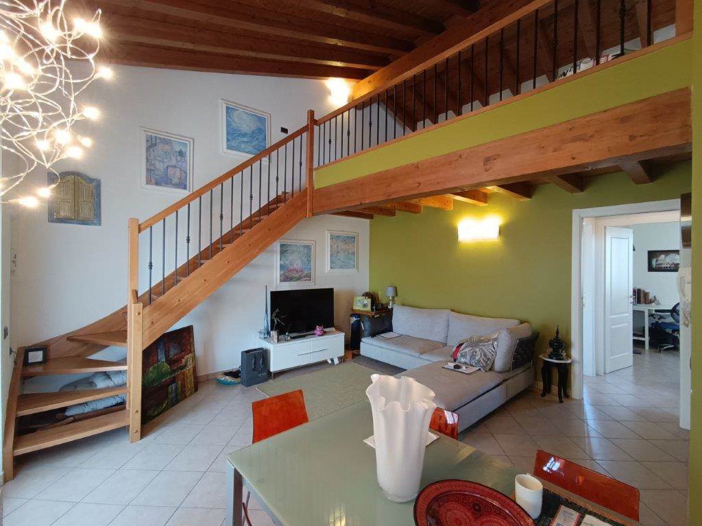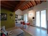 Il soggiorno, molto luminoso, è impreziosito da una grande altezza interna, sovrastato dal tetto in legno con travi a vista per tutta la sua superfice. La zona cucina, parzialmente separata, dispone di un'ulteriore portafinesta che accede sempre al terrazzo e volendo, vi sarebbe la possibilità di renderla anche completamente separata senza opere murarie invasive ne costose.