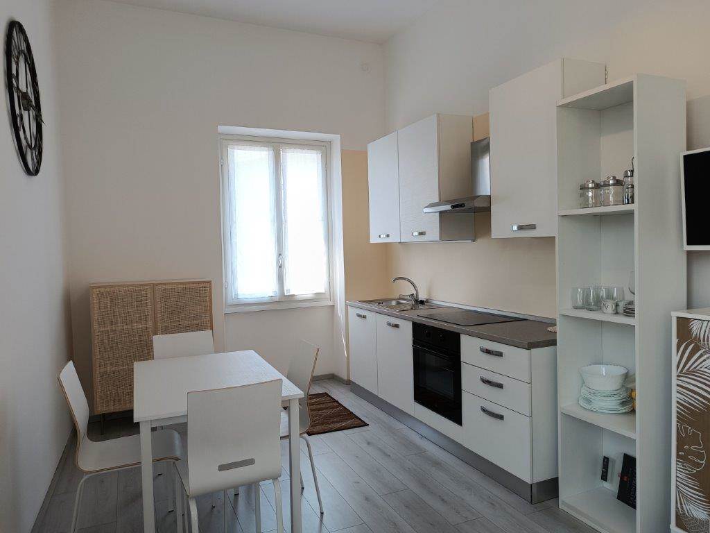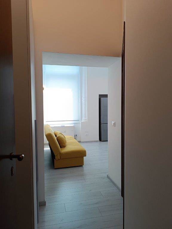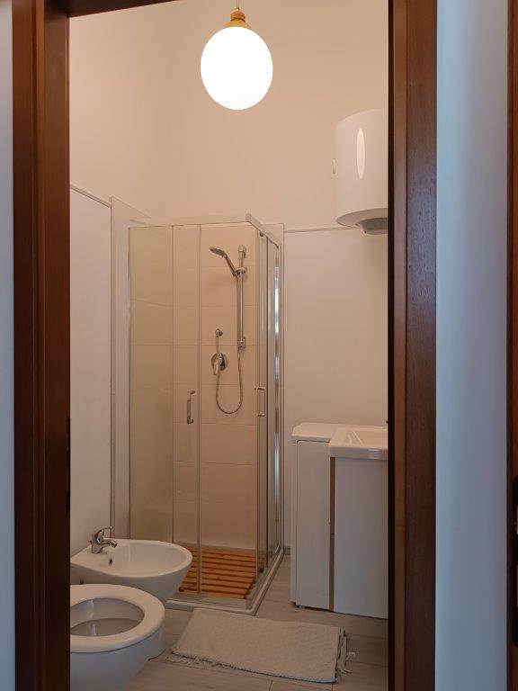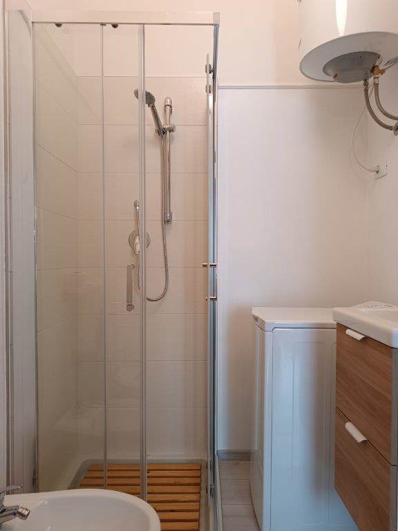 Disposizione: ingresso da vano scale comune, corridoio con armadio e asciugatrice, disimpegno, accesso al soggiorno con angolo cottura dotato di divano letto, bagno con doccia e aerazione dotato di lavatrice, camera matrimoniale.